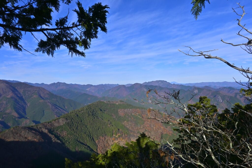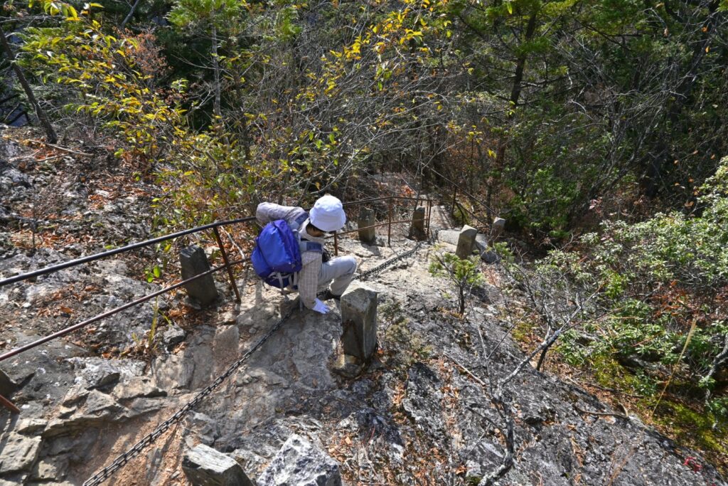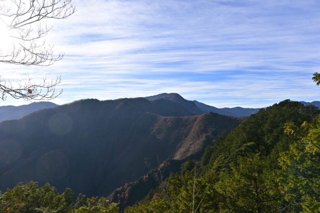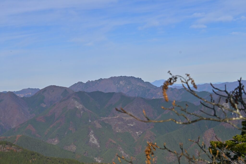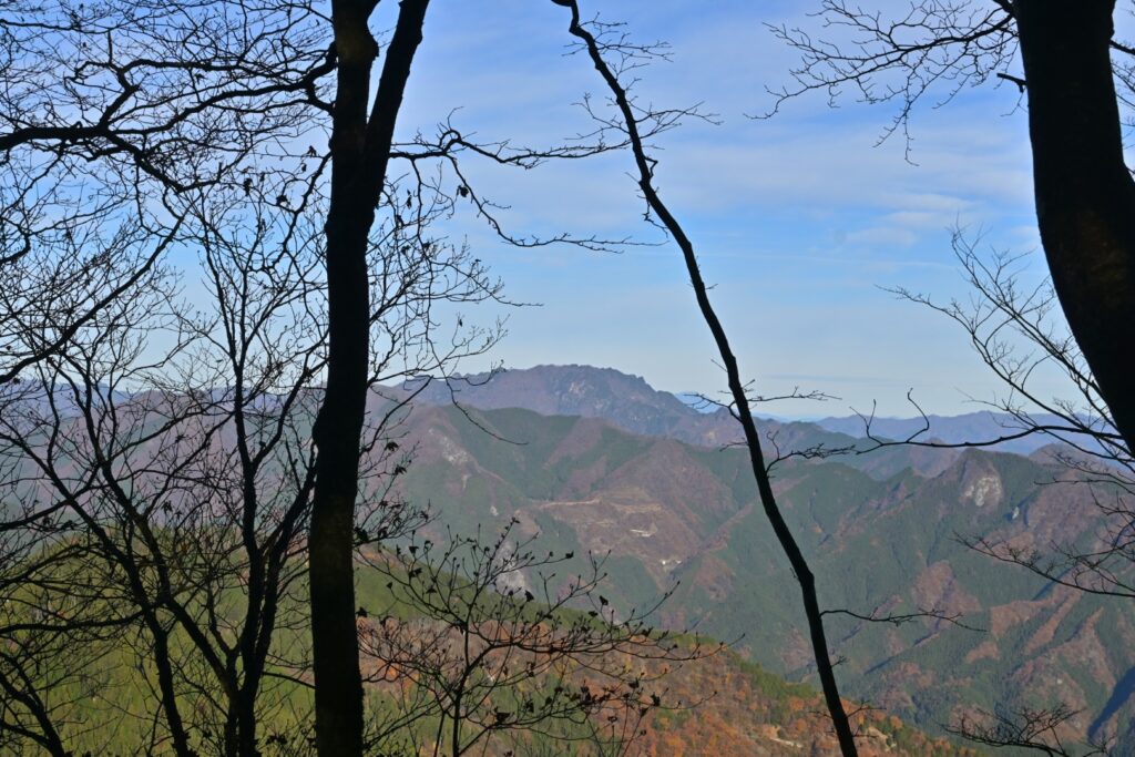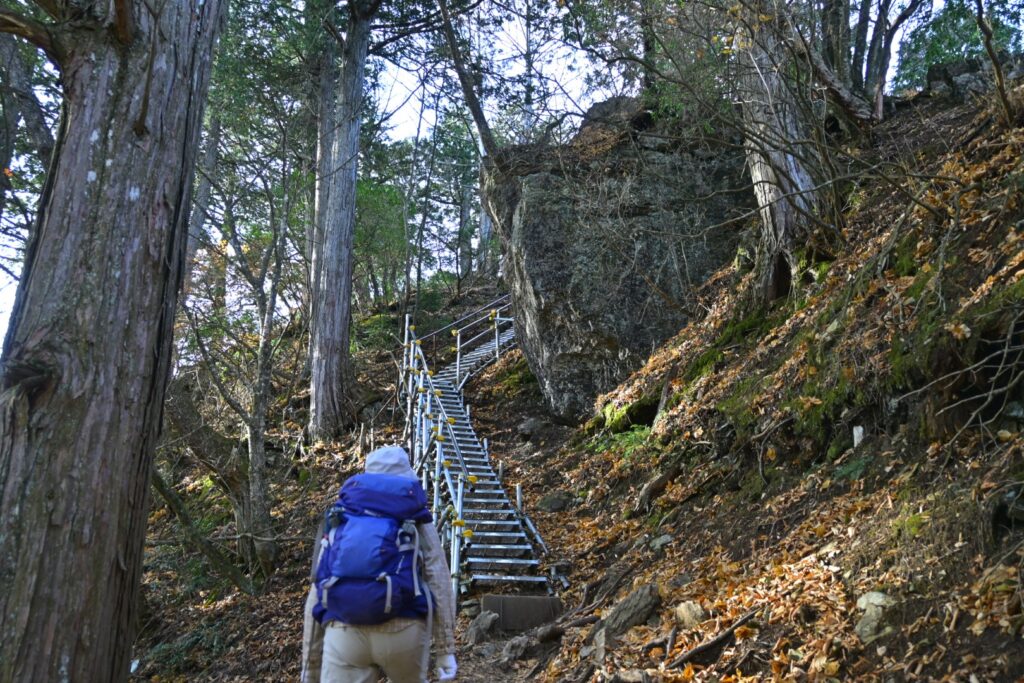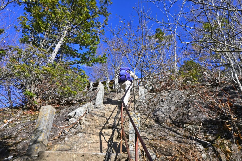 雲取山へと続く尾根から離れて妙法ヶ岳に向かいます。ここから岩稜歩きが楽しめるのかなと思ってたけど、岩稜になってるのは最後の山頂への登りだけでした。あとアップダウンは結構あったけど、階段が完備されていました。かなり急な階段でしたけどね。