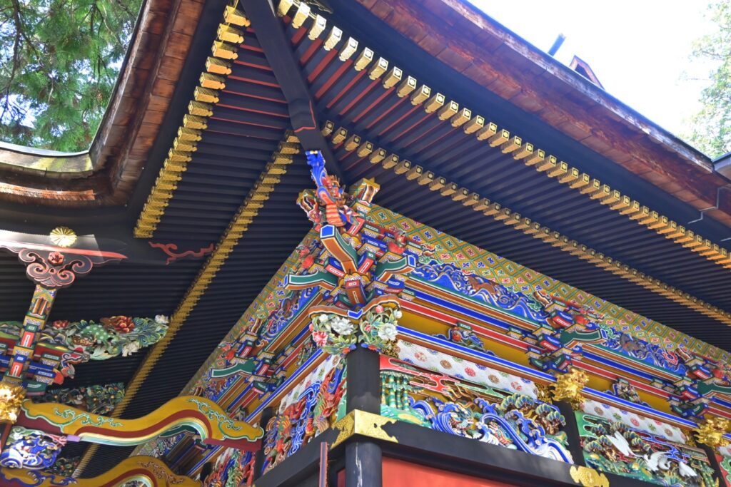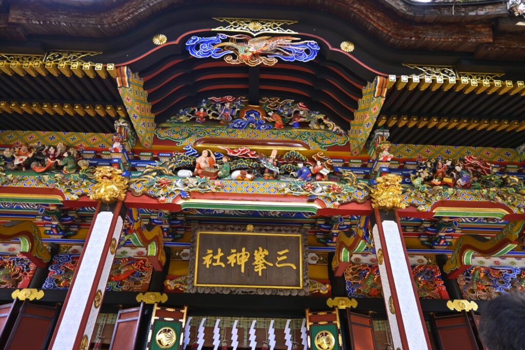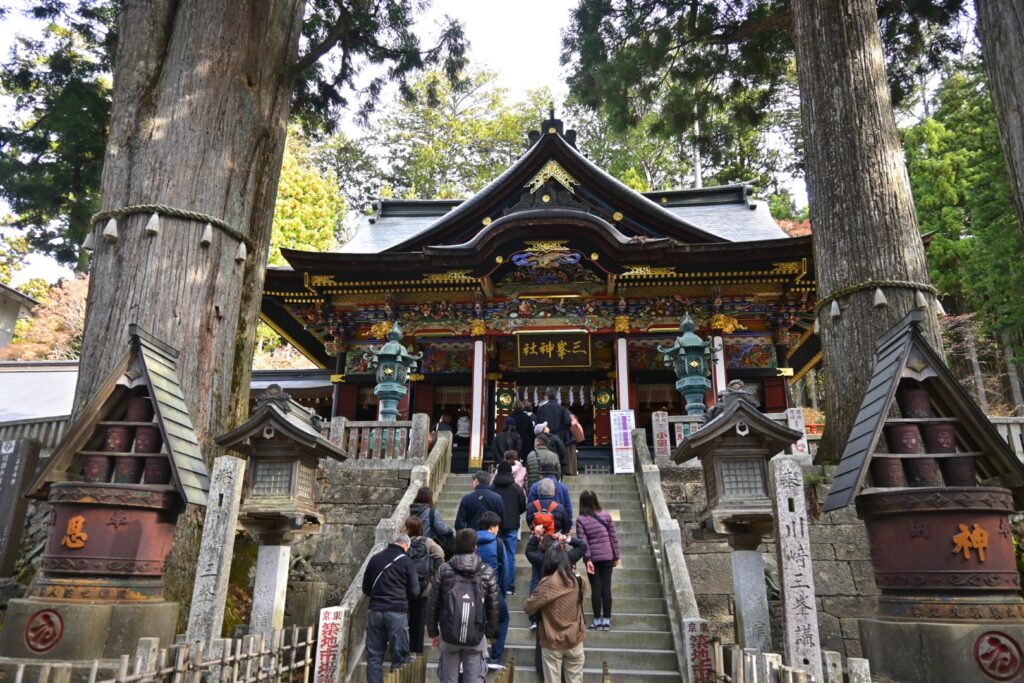 下山後に三峯神社に参拝です。駐車場は軽く満車になってますね~。お店も神社への道も賑わっています。三峯神社に向かってると随身門が出てきました。重厚感のある立派な門。門をくぐっていくと本殿が。同じ豪華絢爛でも日光東照宮の色使いよりは地味でした。本殿へのお参りの列にならんでお参りを済ませます。