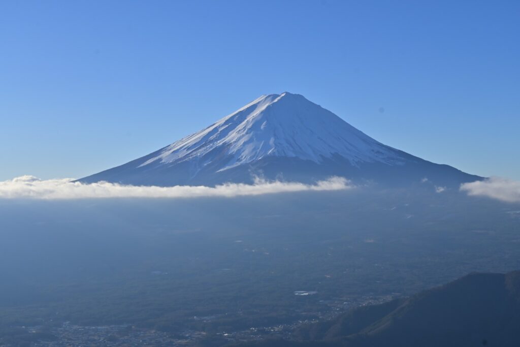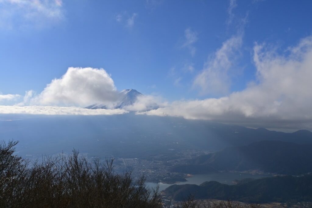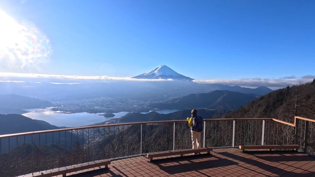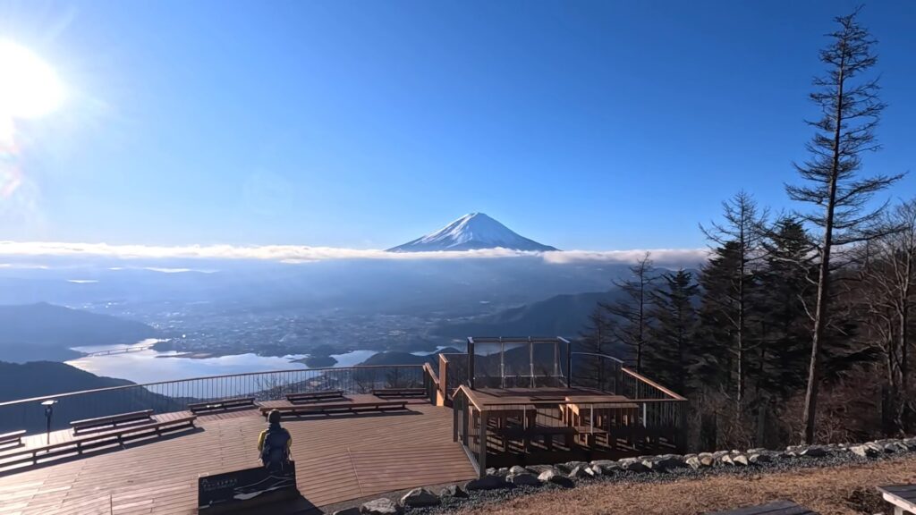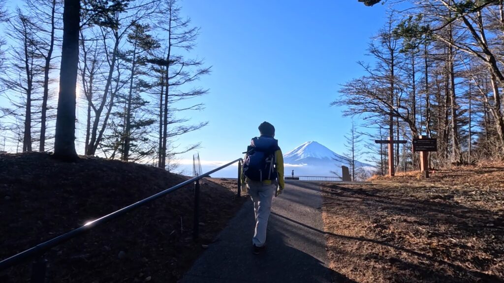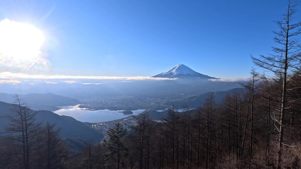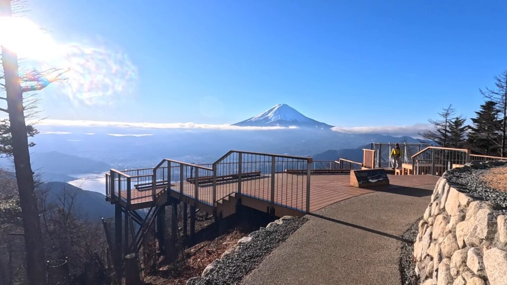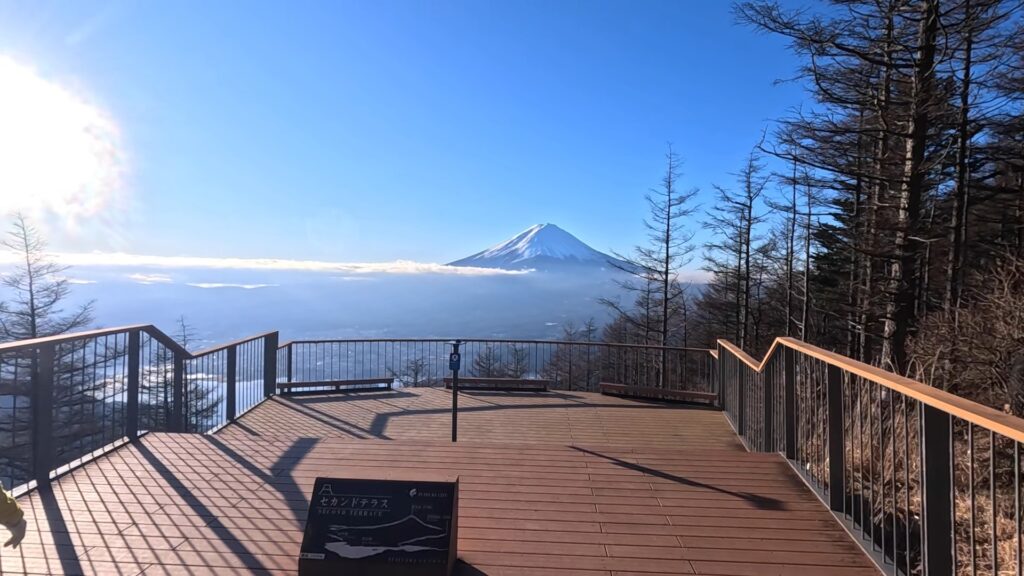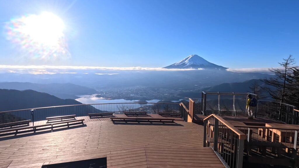 バスの終点から整備された遊歩道を登ること少しで新道峠。稜線に出たところにセカンドテラスがありました。河口湖越しの富士山が素晴らしい!構図がいいですね~。すでに8時と言うことで、だいぶ太陽が南に来ています。広角で富士山を撮ると太陽入っちゃいます。でもまだ富士山の東半分は日が当たってて許容範囲です。そういえば、少し前に河口湖側から登ってきて、このセカンドテラスのところに出てきたなあ。