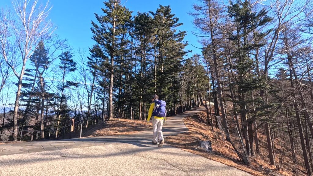 すずらんの里あたりから駐車スペースが点在。ゲートを見送って日向坂峠の方に少し進むと、路肩が広くなったとこがあってそこに駐車。今朝は安曇野も今年一番の冷え込みで、ここもとっても寒いです。着込んで出発。歩いてると暖かくなってくるもんだけど、稜線の北斜面を通る車道歩きは寒かったです。30分ほどで車道の終点です。バス停にはFUJIYAMAツインテラスとありました。トイレはありますが冬季閉鎖。リリーベルヒュッテのトイレも冬季閉鎖です。トイレは下界で済ませときましょう!
