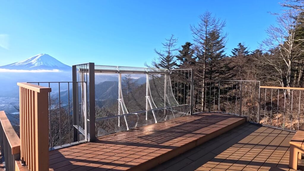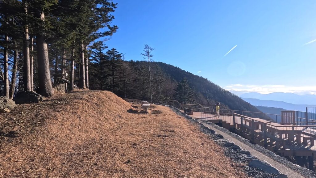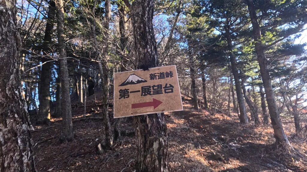 山頂の標識にも書いてある通り、ここから200mほど南に進むと富士山展望スポットがあります。これに気付かずに山頂だけ登って帰る人とかいるかも…?展望には興味なくて素通りする人はいそうですが。FUJIYAMAツインテラスからだいぶ登ったので、少し高度感のある展望になりました。ただ景色の広がりとかツインテラスの方が上ですね。