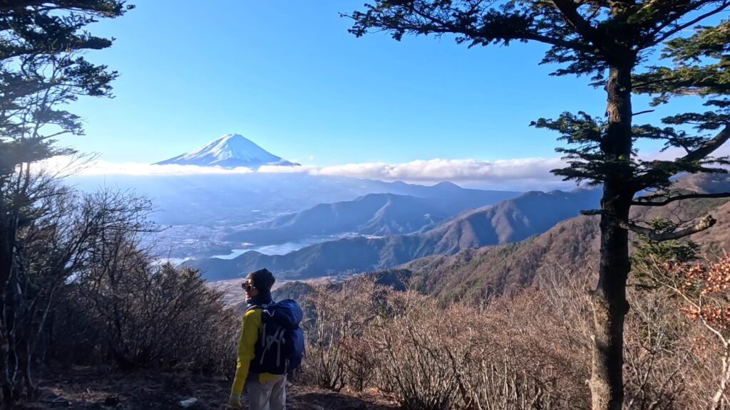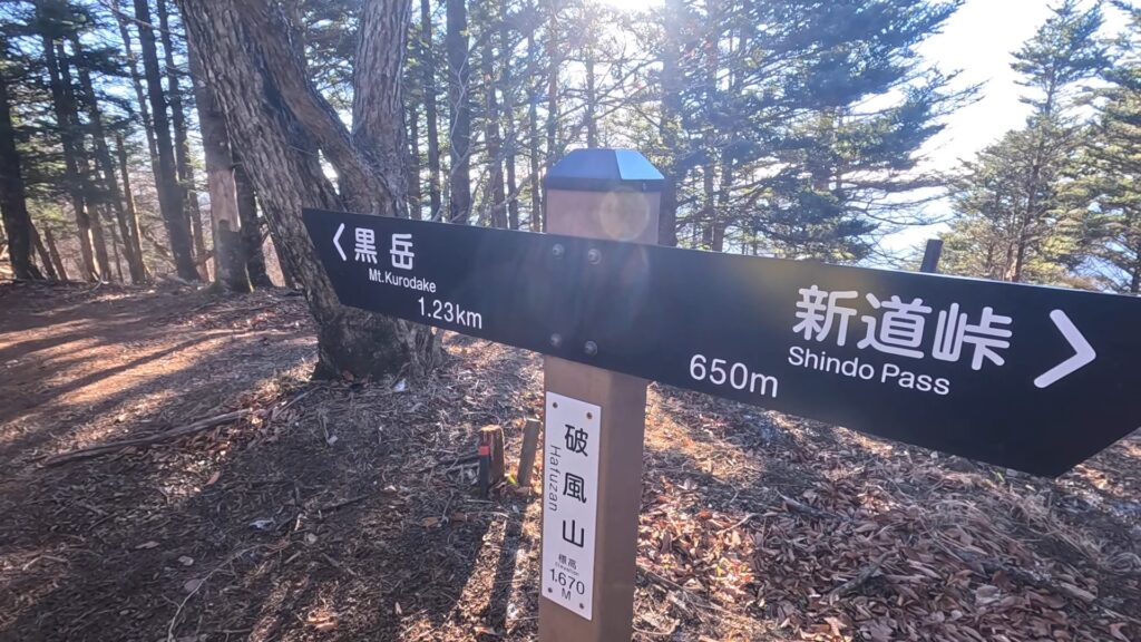 富士山の眺めを堪能したあと、御坂黒岳に向かいます。概ね明るい林になってて気持ちよく歩けます。途中に何ヶ所か富士山の見えるスポットあり。ツインテラスができる前はそこが新道峠の展望スポットの一つだったと思うけど、今ではもう影が薄いって感じです。黒岳の途中に一つピークがあって、それが破風山。そこから少し下って、やや本格的に登ったところが黒岳です。