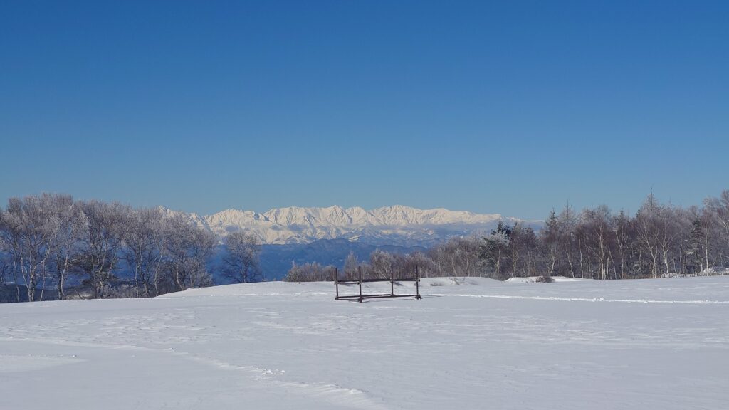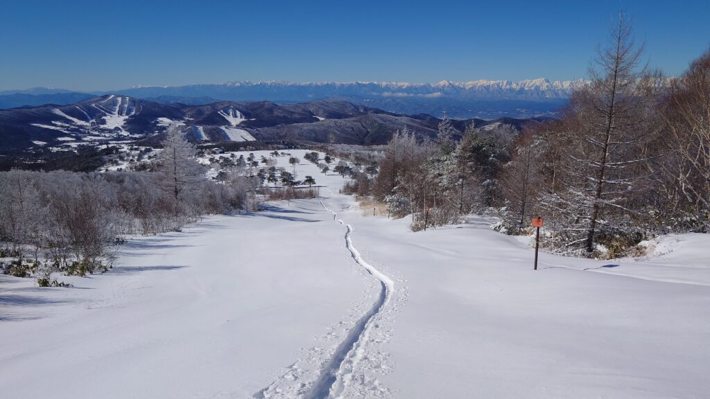 ツアーコースはかなり快適。なんだかんだ登ったり滑ったりする人がいるからでしょう、ズボズボ埋まりません。端っこにはみ出すとダメですが。笹の姿が見えるところには近づかないのが無難…。新雪がしっかり積もってて、滑った跡も2人分くらいなので、概ね気持ちよく滑ることができました。途中でスノーシューの人たちとすれ違います。牧場はトレースないと滑らないんですが、そこがスノーシューのボコボコ跡になってしまい不快でした。なにはともあれ本日も無事下山であります。