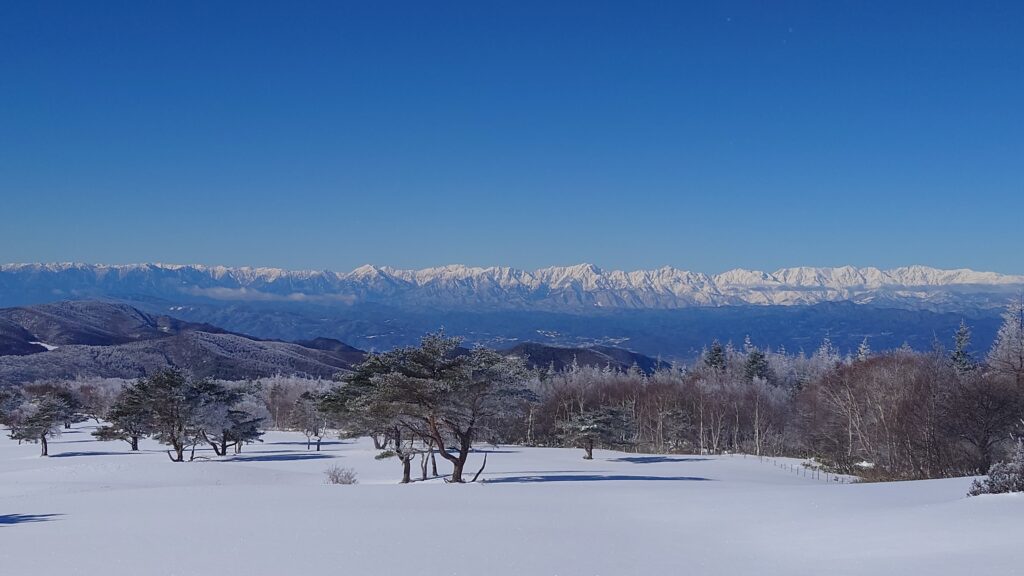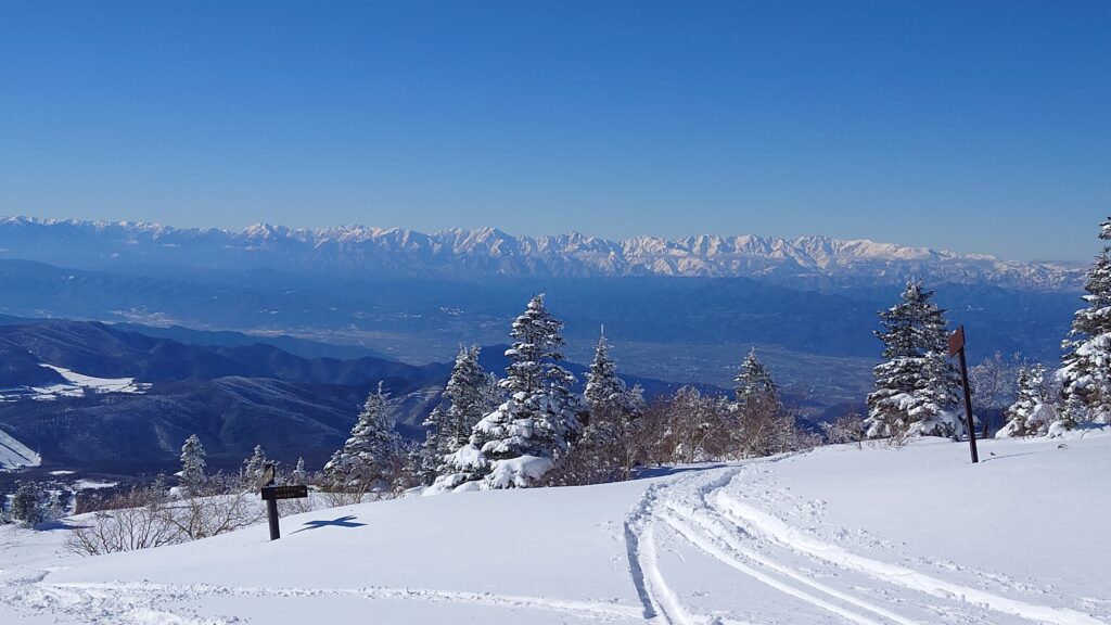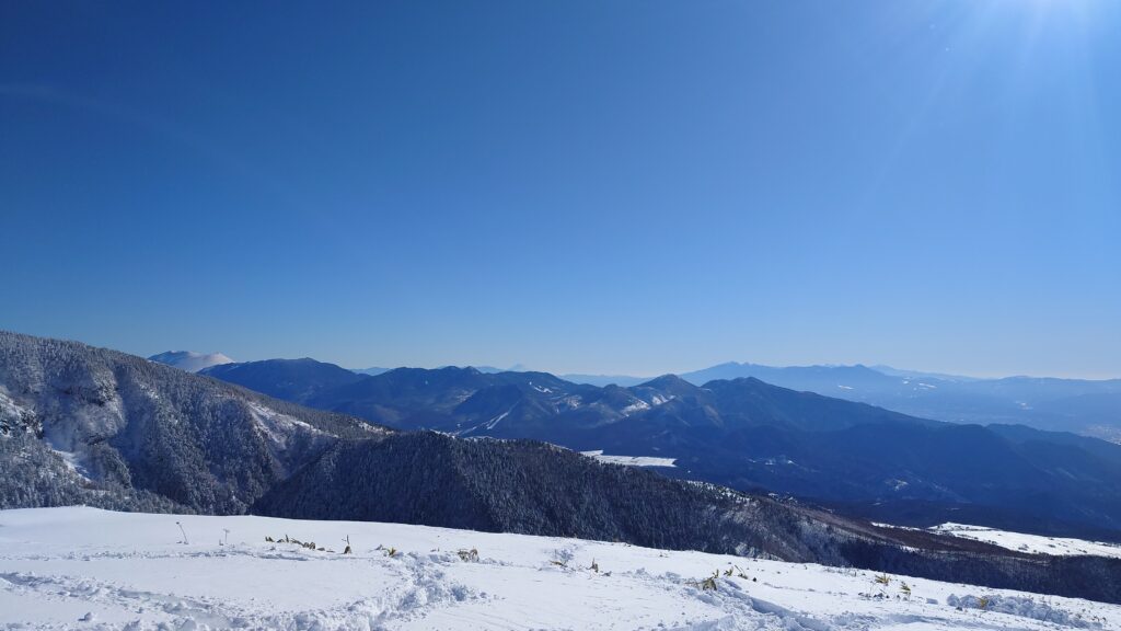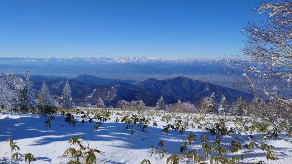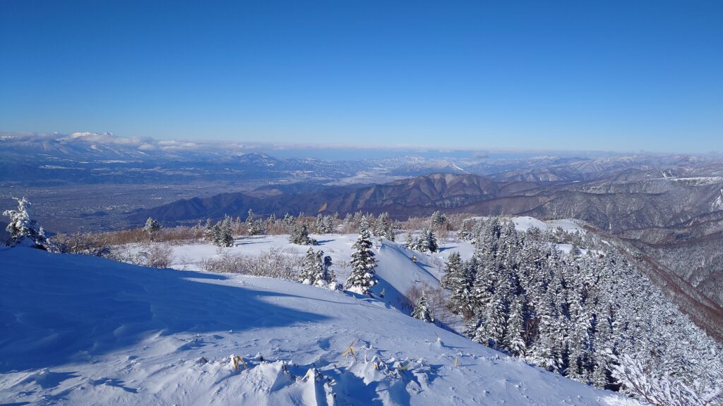 山頂の祠はまだだいぶ土台が出ています。ここらへんは風の影響もあるのでね。志賀高原方面が見えていますが、雪が少ないのか全体的に黒っぽい。北アルプスはもちろん真っ白なのですが、その手前の善光寺平には雪がありません。浅間連峰も雪は少ないです。まあ、まだ1月上旬、これからとはいえ早い時期にしっかり積もって欲しいもんです。
