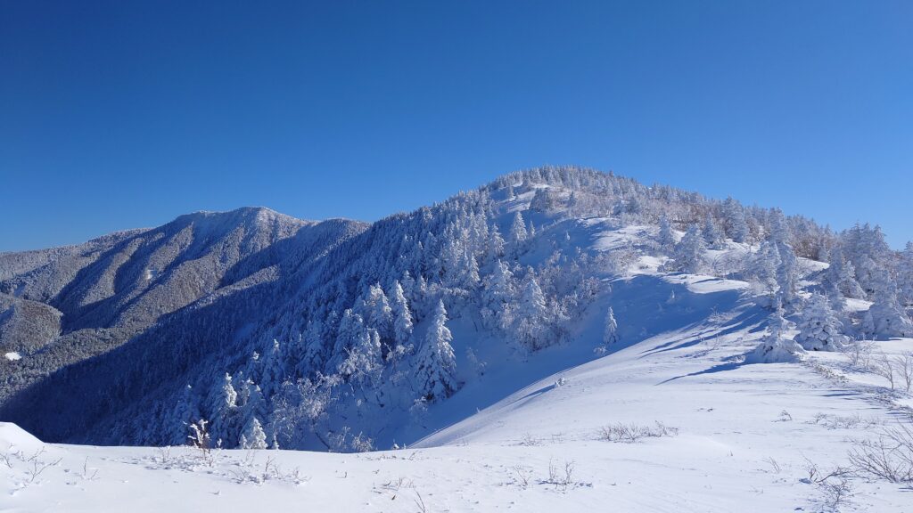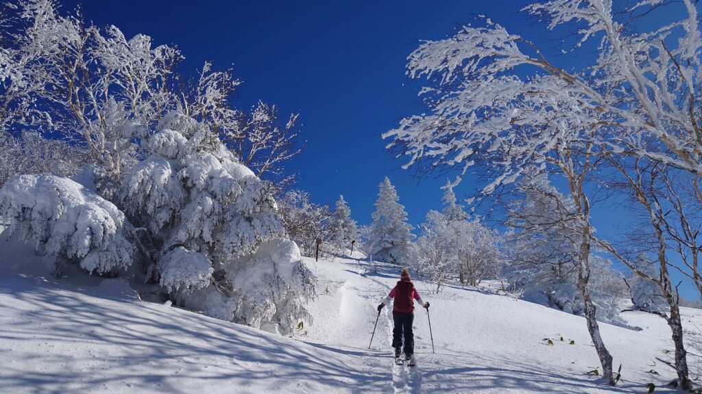 まだまだ雪は足りないとは思いつつ、どのくらい積もってるか様子見で根子岳へ。小根子あたりから上はわりと雪があり、下地もしっかりしていました。小根子から下は雪はあっても下地ができてなくて、スキーでもズボズボ陥没してしまいます。滑るの無理って感じでした。ツアーコース上は人通りが多いせいか雪は締まってて、新雪もあっていつもより楽しく滑れました。雪の量や質はともかくとして、今日は天気がよくて樹氷がキレイだったのが一番です。