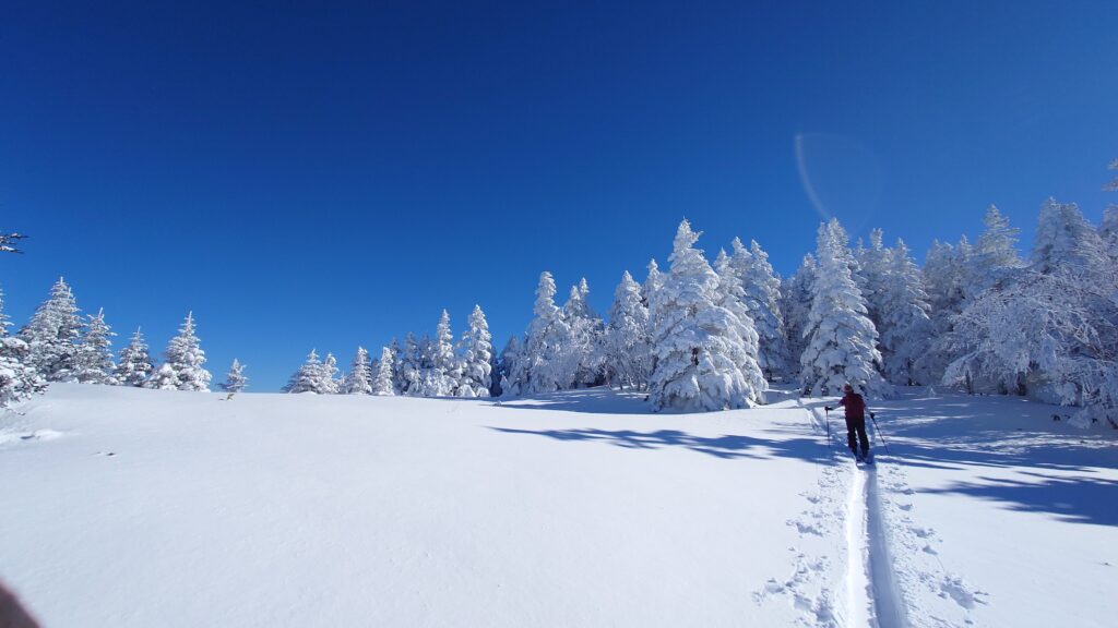 クリスマスあたりに雨が降りました。少々高いところも雨だったと思われます。自分の想像ですが、根子岳では2000mより少し上を境に雪だったのかと。小根子付近から雪の量がグッと増えました。キャット終点からの樹氷の森も安定して雪があります。下地もできていました。雨が降るか雪なのか雲泥の差ですからね。雪が降れば増えるけど、雨だと融かしますからね。