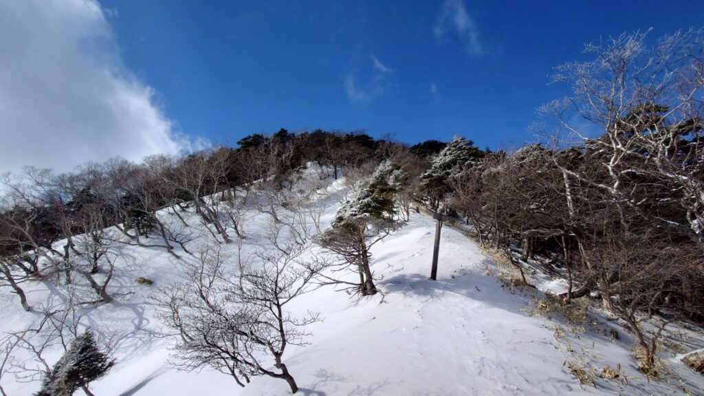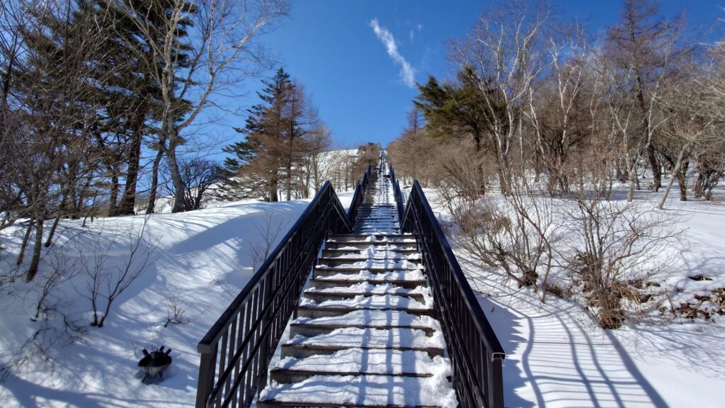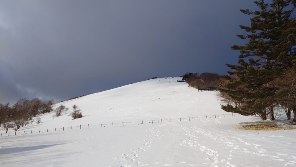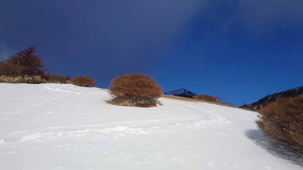 下段は緩斜面になります。ジグザグ道のロープが邪魔なところです。ここは階段の左側に行く古いトレースがあったので辿ってみると、なんの邪魔物もなく普通に滑っていける斜面がありました。登りもこっちからにしとけばよかったけど、これも後の祭りであります。次回があればそうしよう。次回があるとすれば、もっと条件のよい時に…ということになりますが、なかなか当てるのは難しそう。冬型ではそんなに降らなさそうなので、南岸低気圧の直後ってとこでしょう。あとはザラメ化してからだな。ということで、本日も無事下山であります。