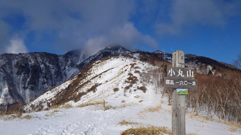てっぺんには展望台。せっかくなので板はずして登っておきました。元スキー場の斜面を見下ろせるのと、正面に高原山が良く見えたくらいの展望でした。鹿除けゲートの外に出ると、そこからは登山道って感じかな。尾根道で基本登山道に沿って進みました。途中に小丸山山頂の標識。右手にあるのが丸山かな。尾根道はツツジの灌木帯。石がゴロゴロ出てたり、登山道の部分だけ雪が残ってたり。
