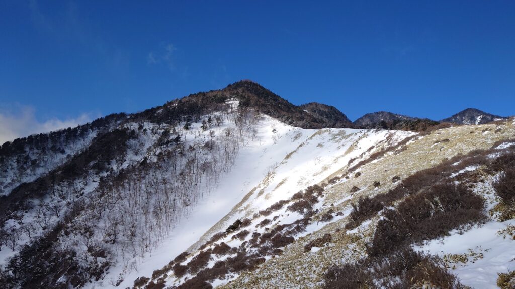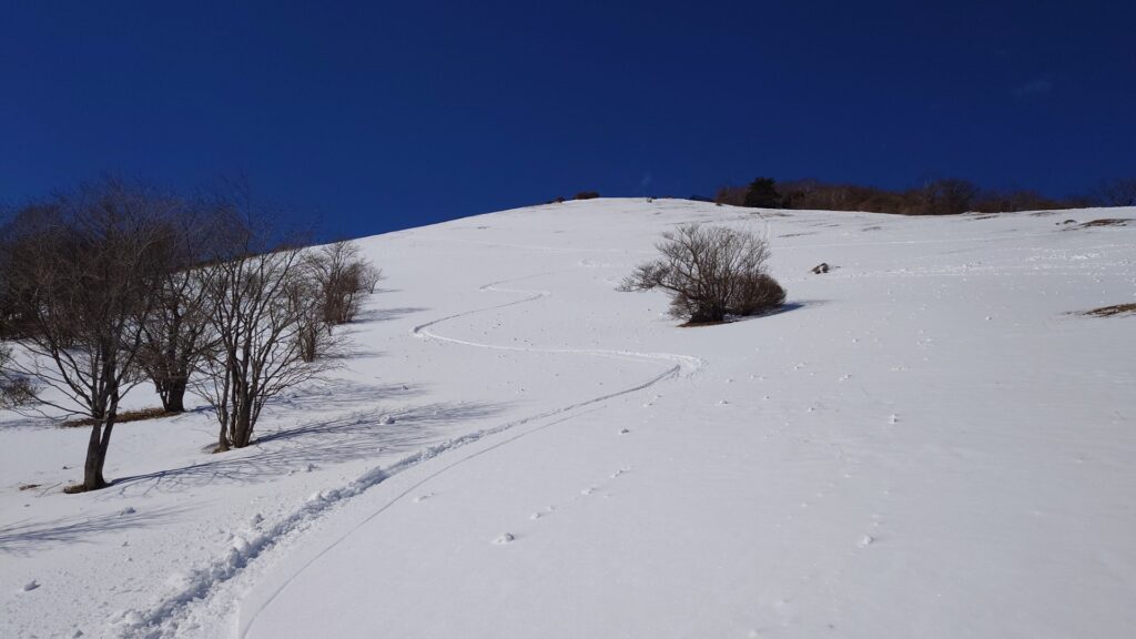このあとも条件が良ければ楽しめそうな斜面が丸山のコルまで続きます。でも今日は条件悪い。雪が少なくて下地ができてなくてズボズボ。二度ほどズボッとハマってコケました。今回は雪不足で石とか踏むことを警戒してウロコ板。ズボズボ埋まるところは冬板の方が有利だったかも。まあでもせいぜい少しマシ程度なのかな~?あわよくば丸山にも登ってみようと思ってました。丸山の斜面に生えるツツジは密生してて、登る隙間もないくらい。なのでやめた。登ってきた尾根へとトラバースです。ここはウロコの利点が生かせました。