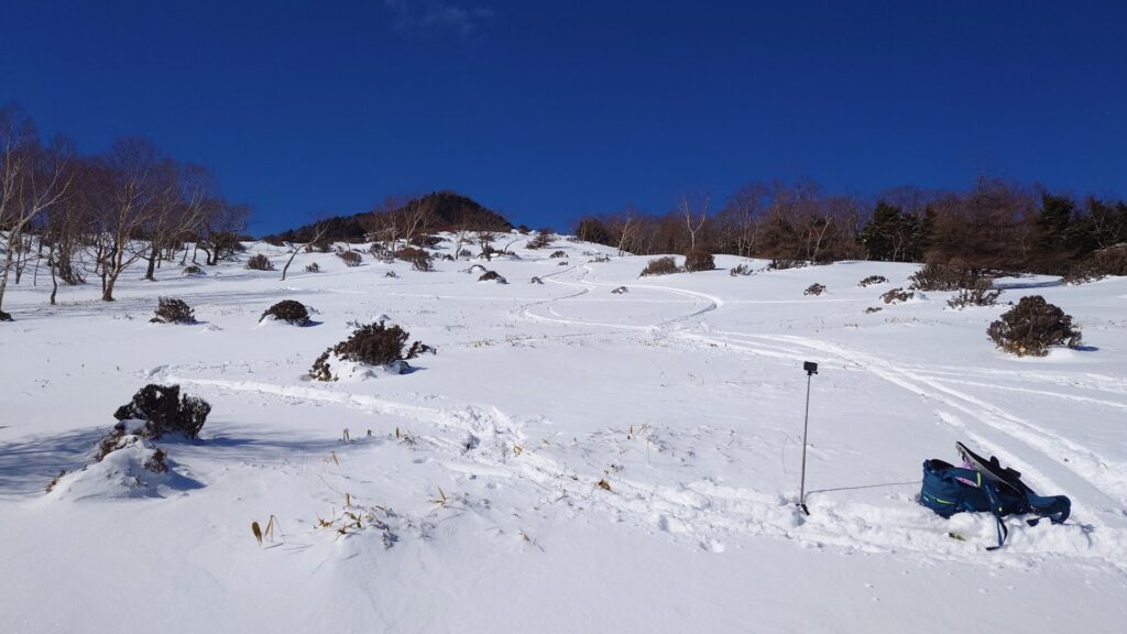 あとはキスゲ園地を滑ります。上部は登った時より草の露出が大きくなってます。なんとかやりすごします。上段斜面の中間くらいまでは、滑るというより下るのみって感じ。下半分はテレマークできました。なので、一度だけ登り返して滑っておきました。が、この二度目の滑りが痛恨のクライミングサポート下げ忘れ。なんか変だなとは思ったけど…後の祭りでした。