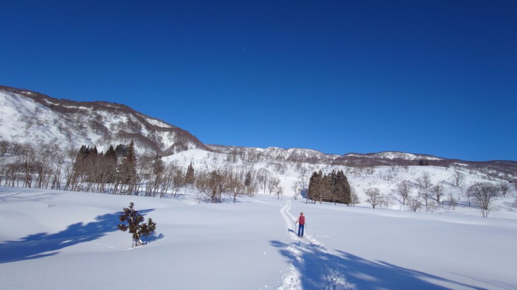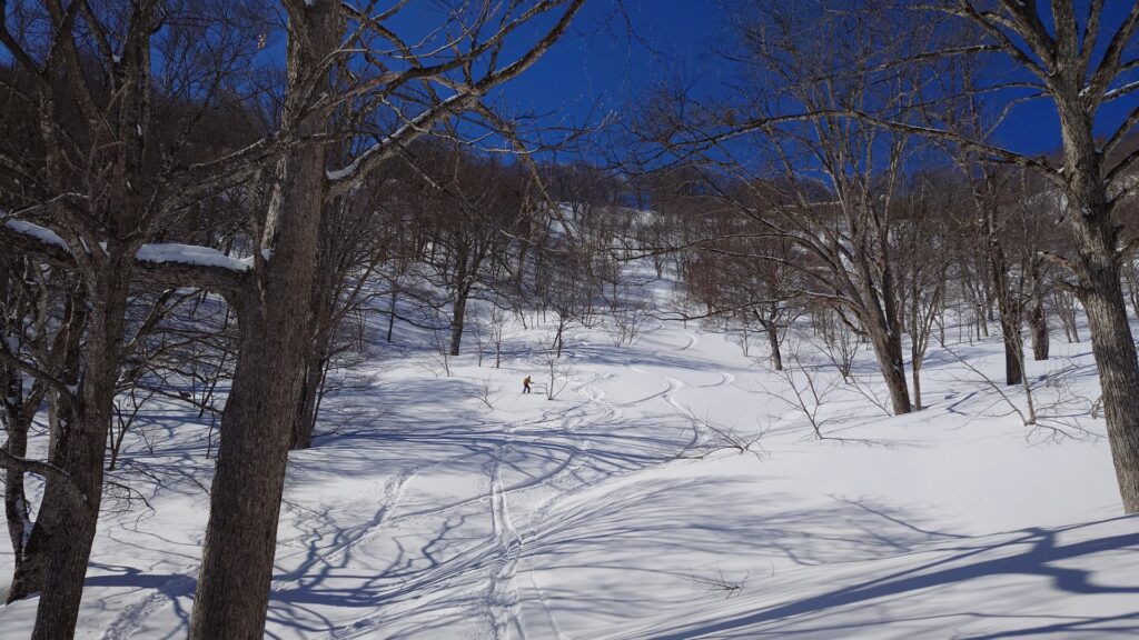 今日は下山後に東北へと北上します。なので1本勝負。山頂からハーフパイプ、ブナ街道、巨木の谷、登った尾根の北面、777台地、田茂木池台地、温井…と、定番コースで。巨木の森への斜面が難しい雪だったかな~。単に斜度があるから難しかっただけかも…?最近なんだか変なクセが付いて、ターンのつなぎが上手くいきません。それが原因は間違いないところ。矯正しないとまずいな。
