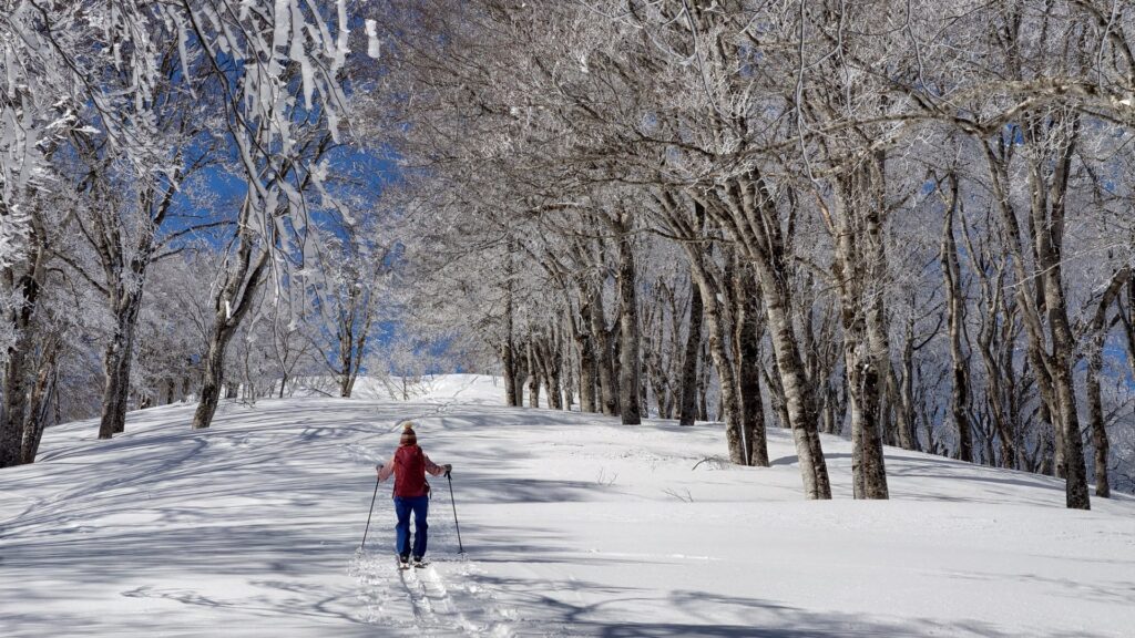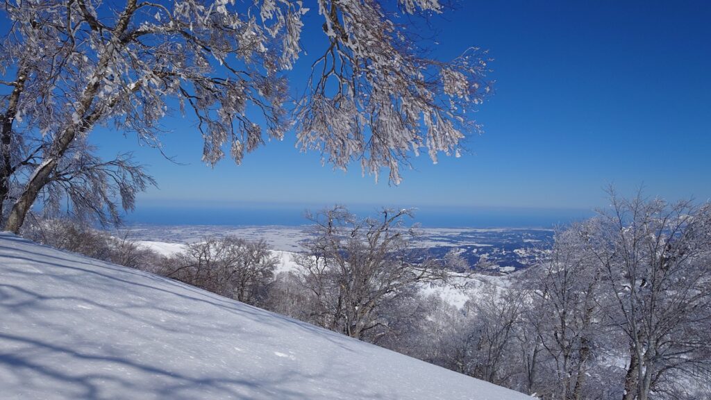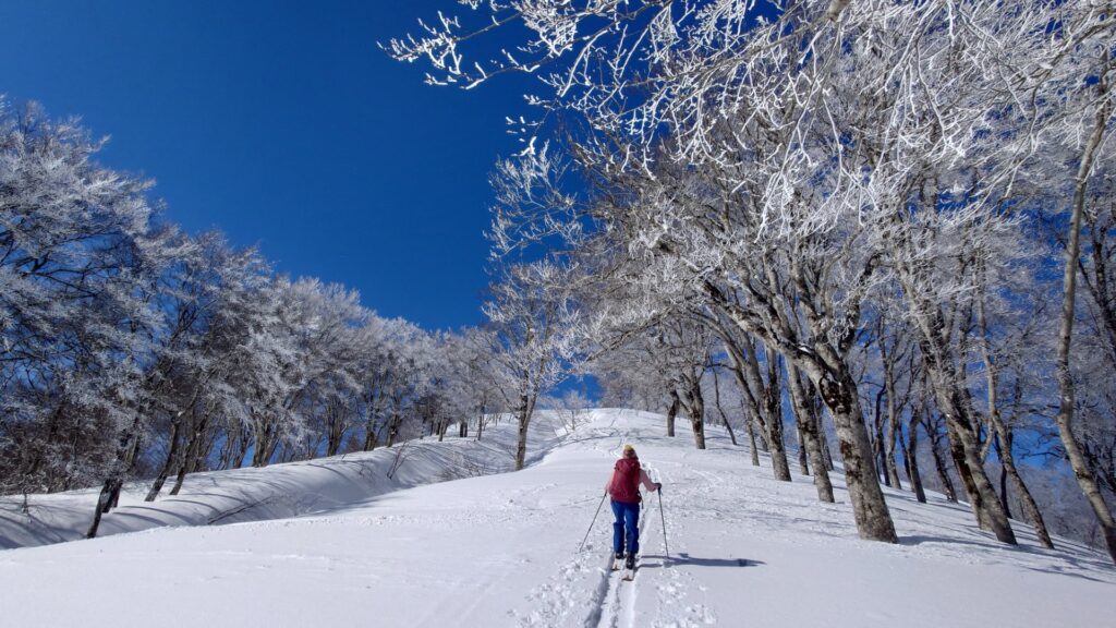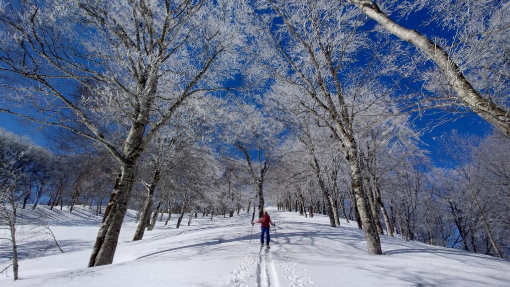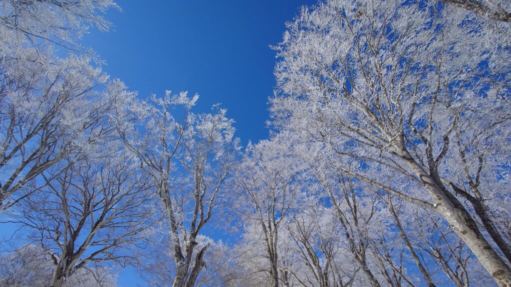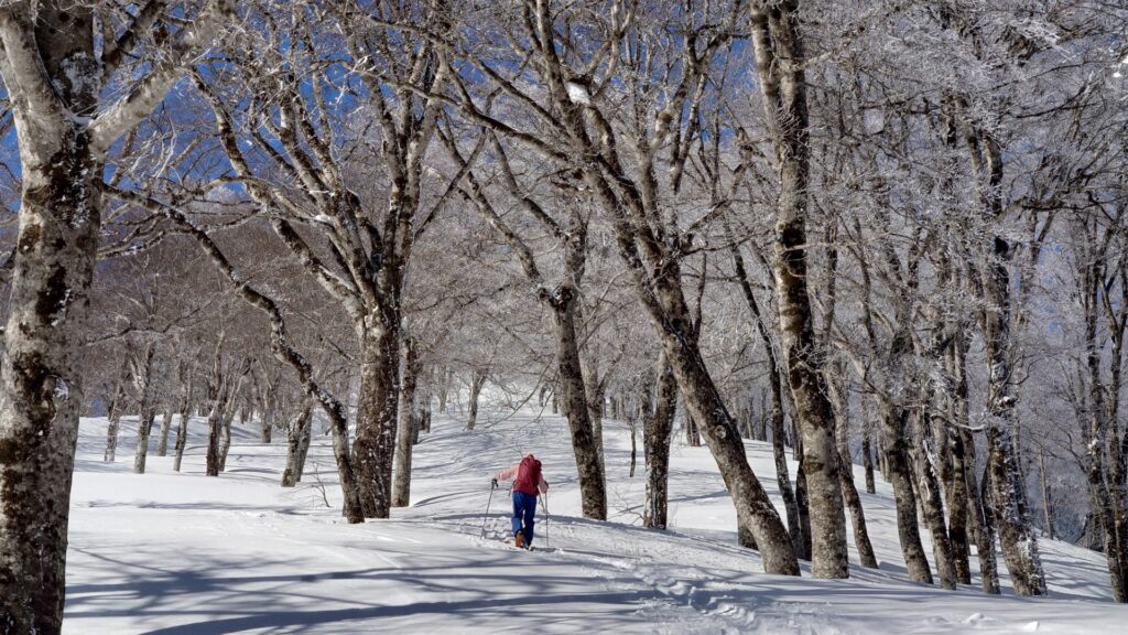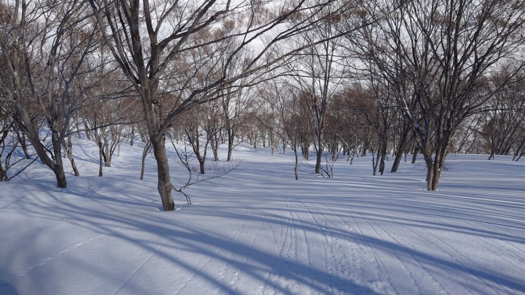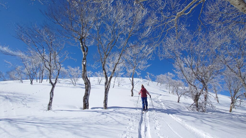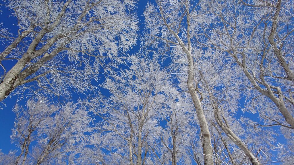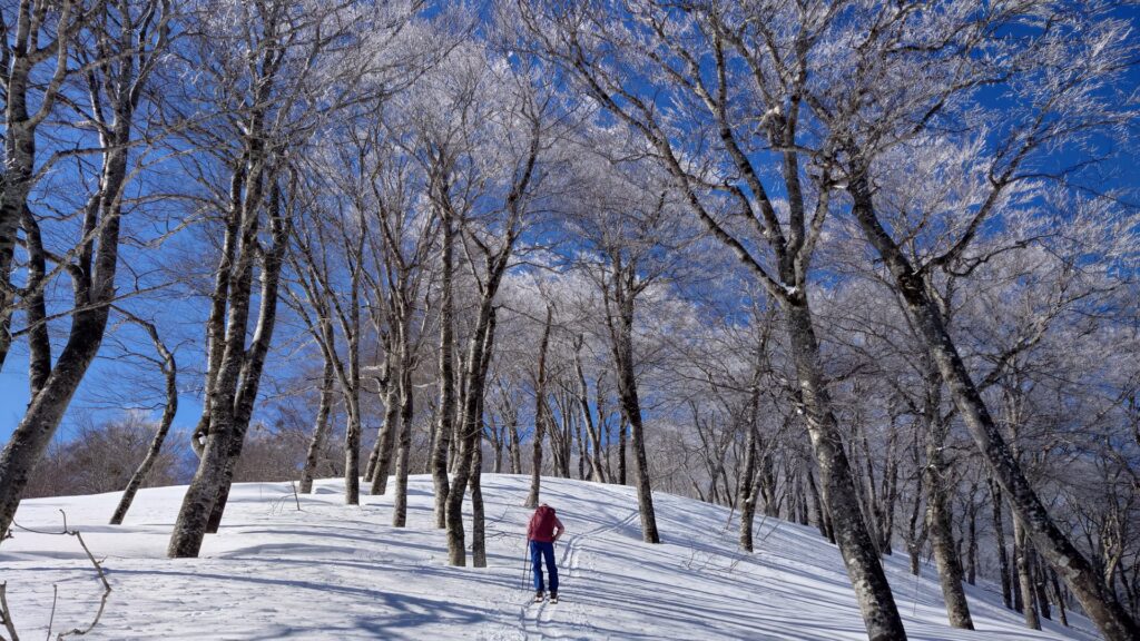 で、そのブナの樹氷の森。冒頭にも書いたけど、今日は薄っすらと付着する樹氷でキラキラ透明感のあるタイプ。ビッシリ着いて真っ白になる樹氷もいいけど、今日みたいな薄っすらキラキラ系もなかなかです。ビッシリ着くのと薄っすら着くのは、降る雪の質が違うからなんだろか?気温とか風とかも関係あり?ほどよく新雪積もってるので、滑るのもココで確定です。