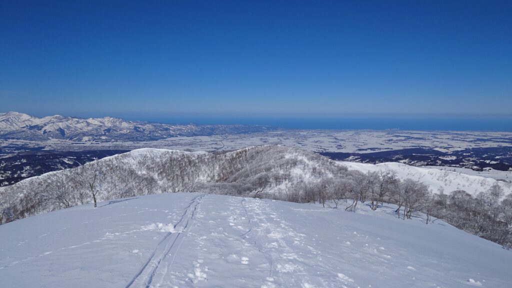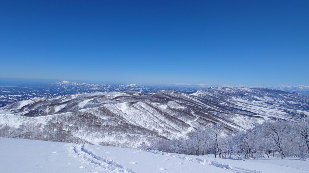 山頂は数名いるだけで閑散としてます。その中に毎日お休みの方がいらっしゃいました。少しお話します。西の沢を滑って黒倉の方に向かうとのこと。依然として快晴です。妙高の山々、日本海、関田山脈北部の山並み、真っ白な越後山脈、野沢温泉から高社山にかけて、いつもの景色が広がっていました。