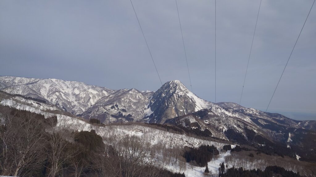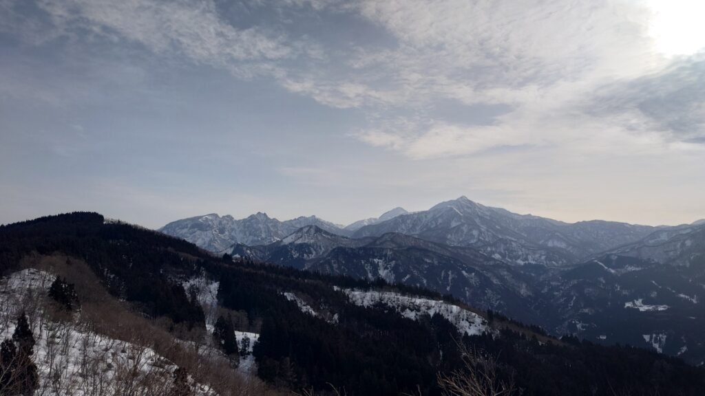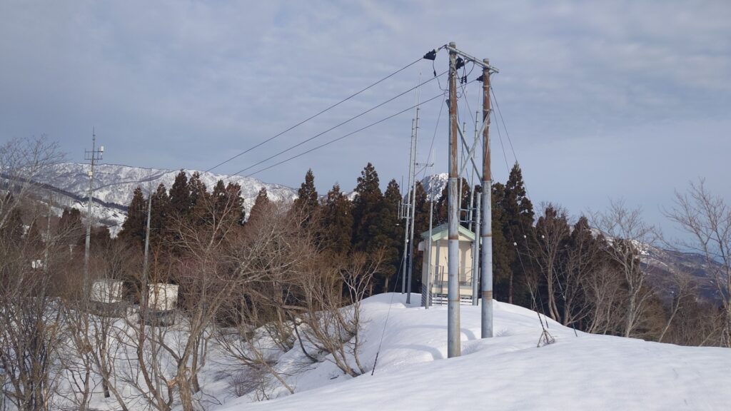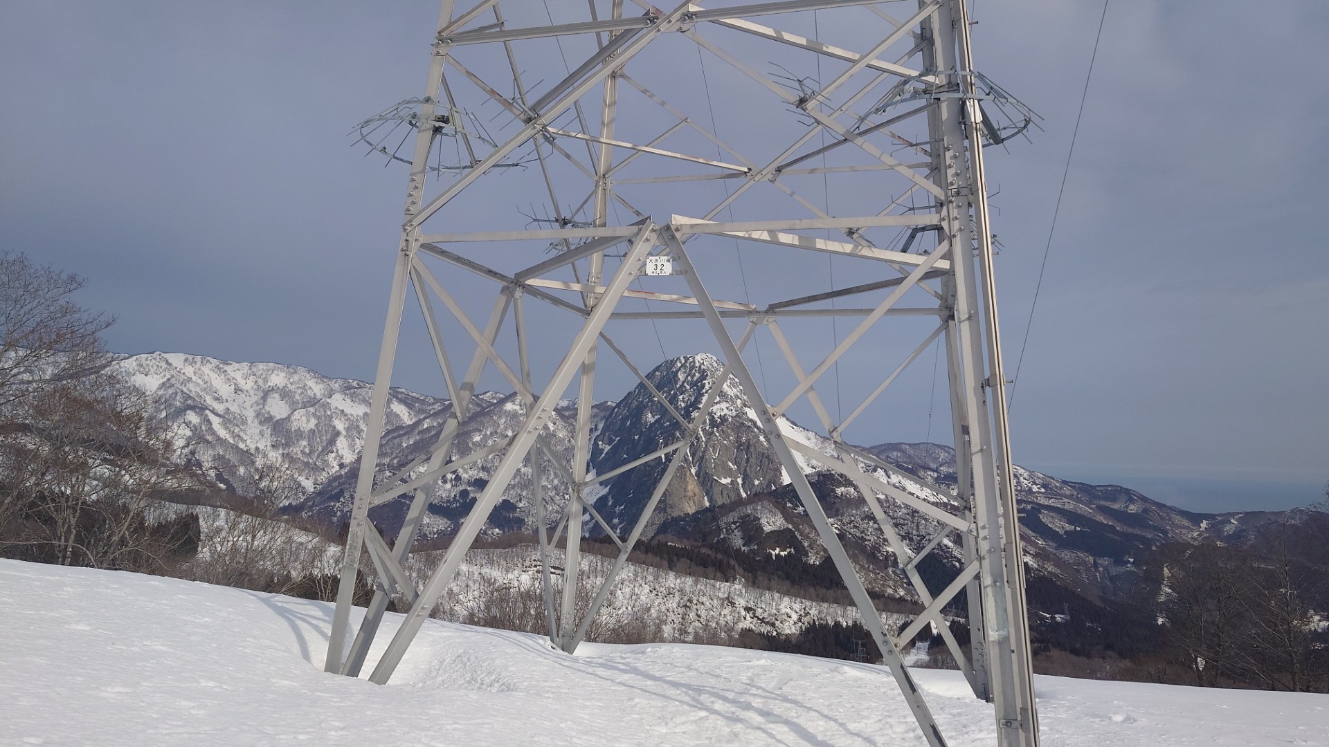 雪が少ないながらもスキーで歩くには十分な量。車道九十九折の法面が地肌出てた程度です。車道を真っすぐ行けば大峰峠のお堂ですが、途中から森の中に入って700mの電波塔を目指します。今のところ霞み気味ではあるけど展望があります。晴れてるうちに先に展望を。700m電波塔は蓮華温泉を取り囲む山々(雪倉岳、朝日岳、黒負山など)と海谷三山の眺めが素晴らしいです。