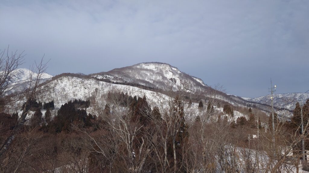 夜が明けたら薄曇り。時々晴れてくれたらいいかな…と思いつつ山之坊に向かいます。小谷に下りだすと、山頂付近に樹氷の着いている大渚山が見えてきました。今年は大渚山にもまだ登ってません。この樹氷を見て少し大渚山にも気持ちが傾いちゃいました。でも、大渚山にミッションはありませんので却下。初志貫徹です。