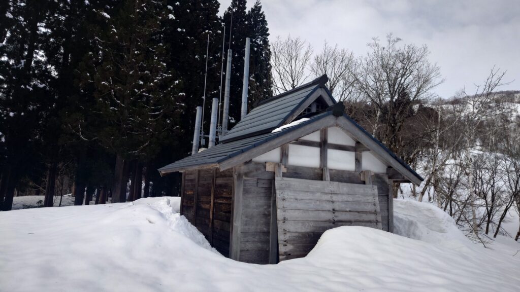 ヒョヒョっと下ったところに大峰峠のお堂。暖かい日が続いたので当然屋根の雪は落ちてしまってます。周囲の雪もだいぶ少なくて、お堂の半分以下の量でした。雪が一番多かったと思われる2月の初旬でどのくらいあったか気になるところであります。