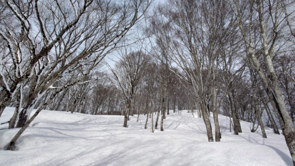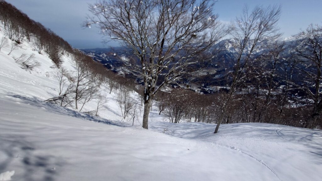 ということで登ってきた尾根を滑ります。細板ウロコですし…。尾根といってもアガリコ大王のとこからは斜面といってもいいくらいのブナ林。樹間もまあまあ広いので楽しく滑れます。重くて大変かもと思っていた尾根の雪は、重いけど滑りにくい雪ではなかったです。北北東斜面滑ると登り返しとか面倒だけど、尾根通しだと900mコルの登り返しだけで済むのもいいところ。