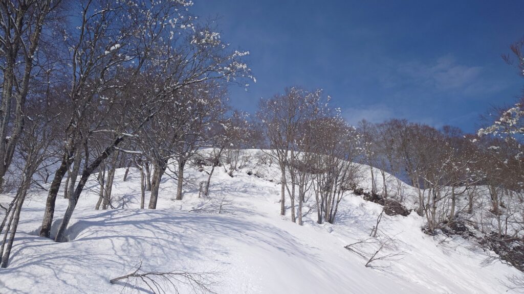 登ってきた感じ、日当たりの悪い斜面にはパウダーらしき雪が残ってます。日当たり良好なとこは重くなってます。パウダー時は山頂直下から北北東斜面に滑り込みます。全体的には緩斜面だけど、地形の変化があって楽しい。今日はとっても微妙。尾根の北側を試しに滑ってみます。パウダーかもしれないけど、パウダーじゃない確率の方が高そうな気がする。
