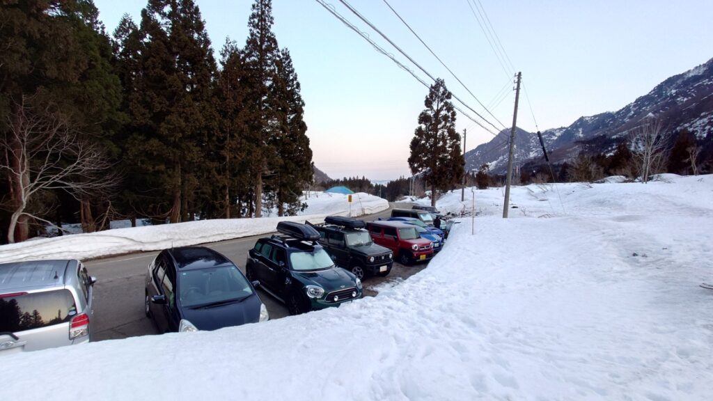 前日は昼闇谷。ほくほく街道走って南魚沼の道の駅で車泊。朝は今の時期にしては冷え込みました。4時半に起きてコンビニ寄って清水に向かいます。西谷後バス停付近に路肩が広くなった部分があるんですが、5時半過ぎで既に満車になってて路駐の列が伸びてるとこでした。広いところに停めるのが安心だけど、車道は広いしこの先行き止まりなので、まあ不安なく路駐できるかなと思いました。