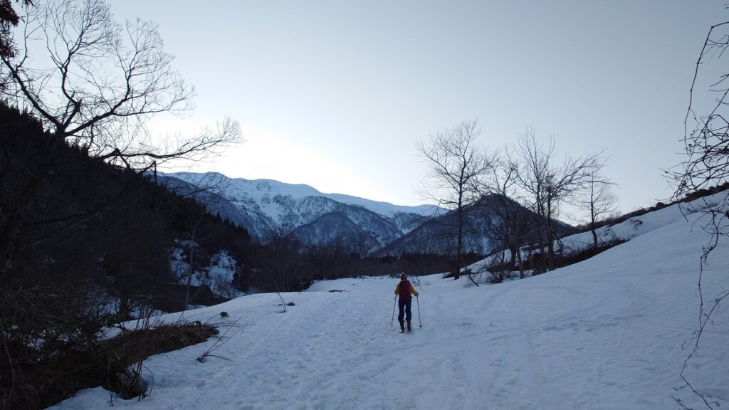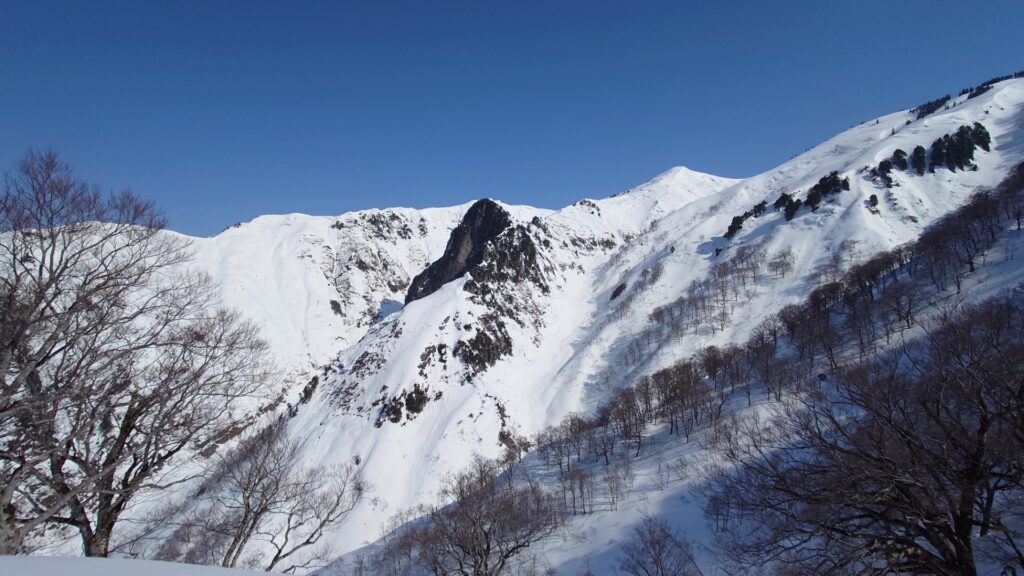 五合目からは斜度が緩んできますが、ついでに次のポコまで背負って歩きました。そこから再びシールで歩きます。歩いてると今度は割引沢の方がよく見える場所に。割引岳の方は南面を見る格好になるので、日当たりが良くて山肌は黒い部分が目立ちました。とくに夏でもよく目立つ黒いタケノコは目を引きますね~。井戸尾根から割引沢へと下る斜面がよさげに見えました。