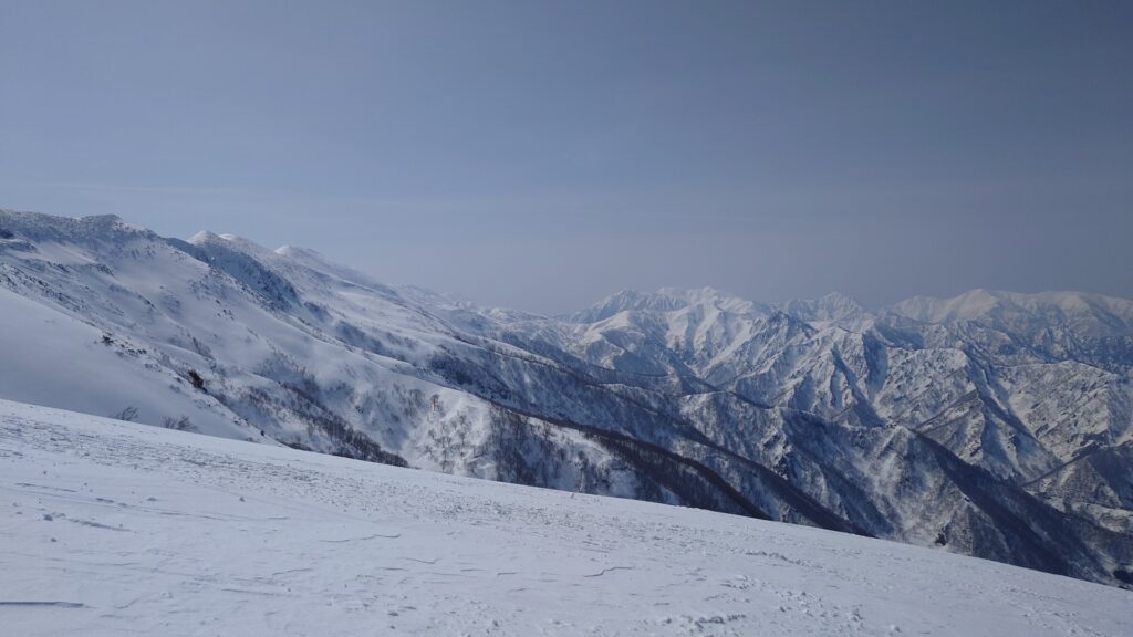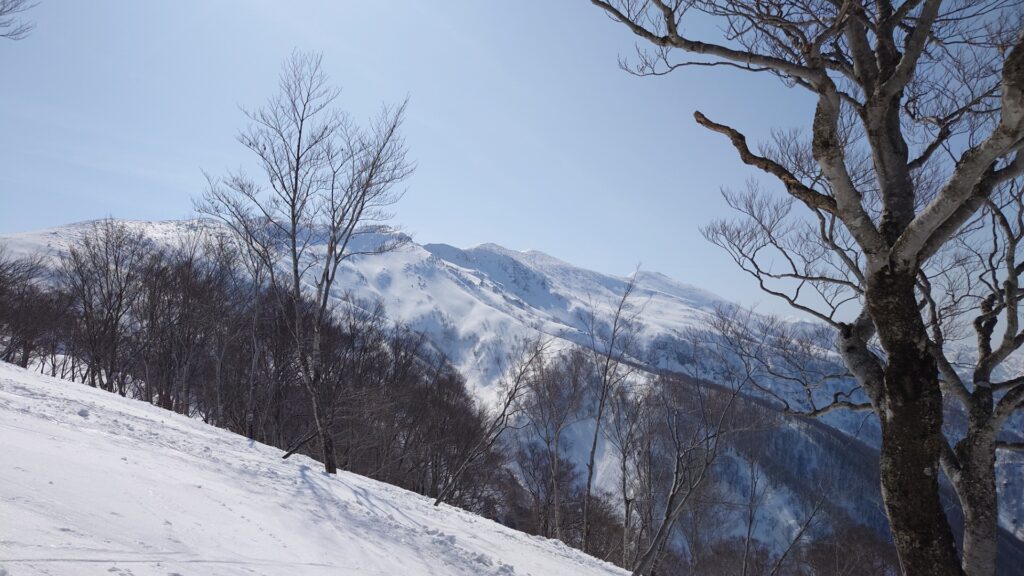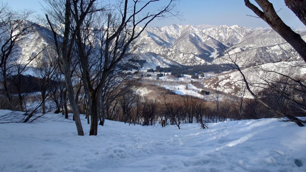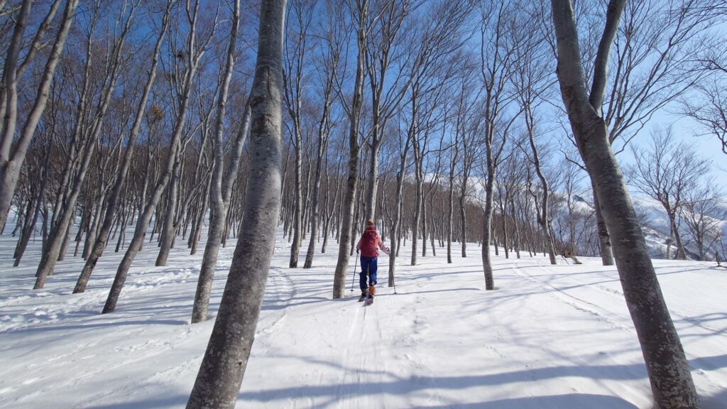 カチカチなので一番手でも何の特典もございません…。滑るというより、ただ下りるだけって感じ。斜度が緩いからまだマシです。少し下るとカチンコチンからカチコチくらいまで緩んできます。やっとテレマークで滑れる。雪は堅くて滑るの大変だけど、滑りながらのロケーションは素晴らしいです。ブナ林になると緩んできました。ただ、昨日少し降った新雪が表面にあるのでザラメにはなりません。