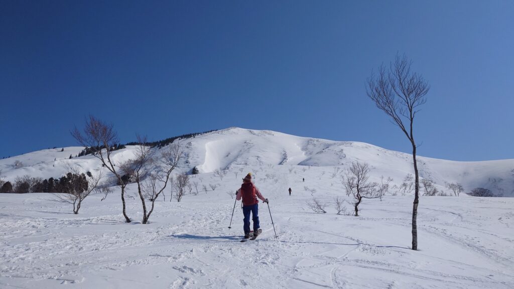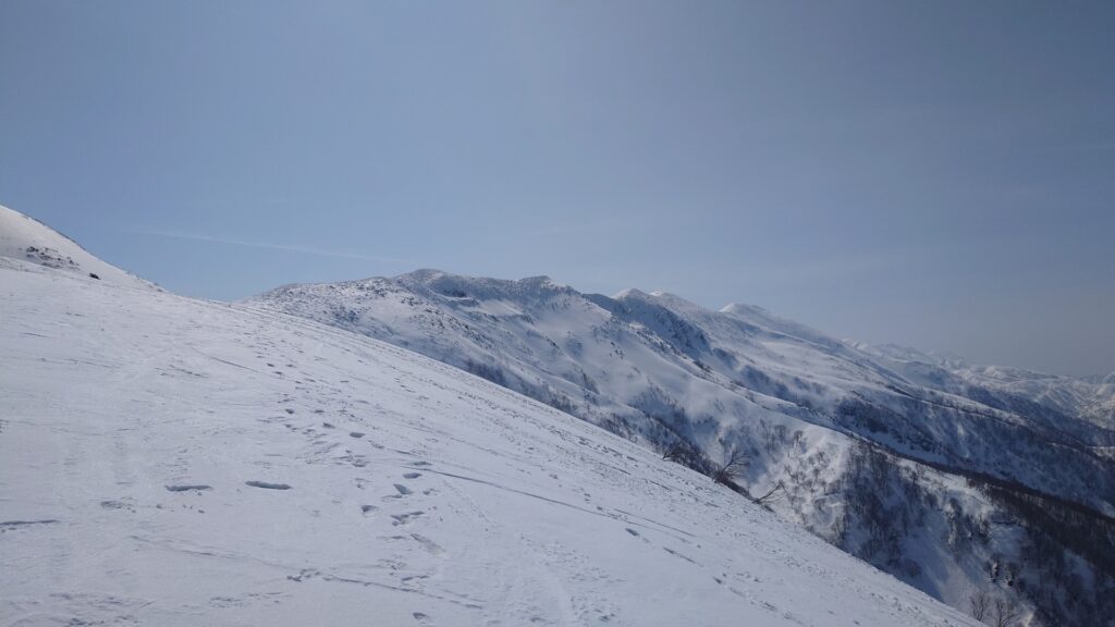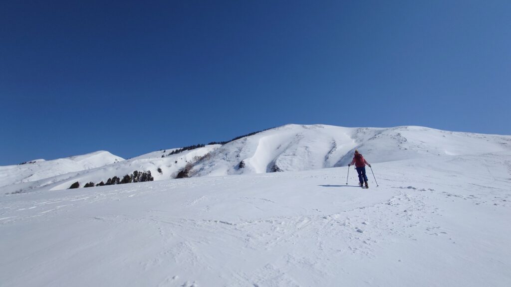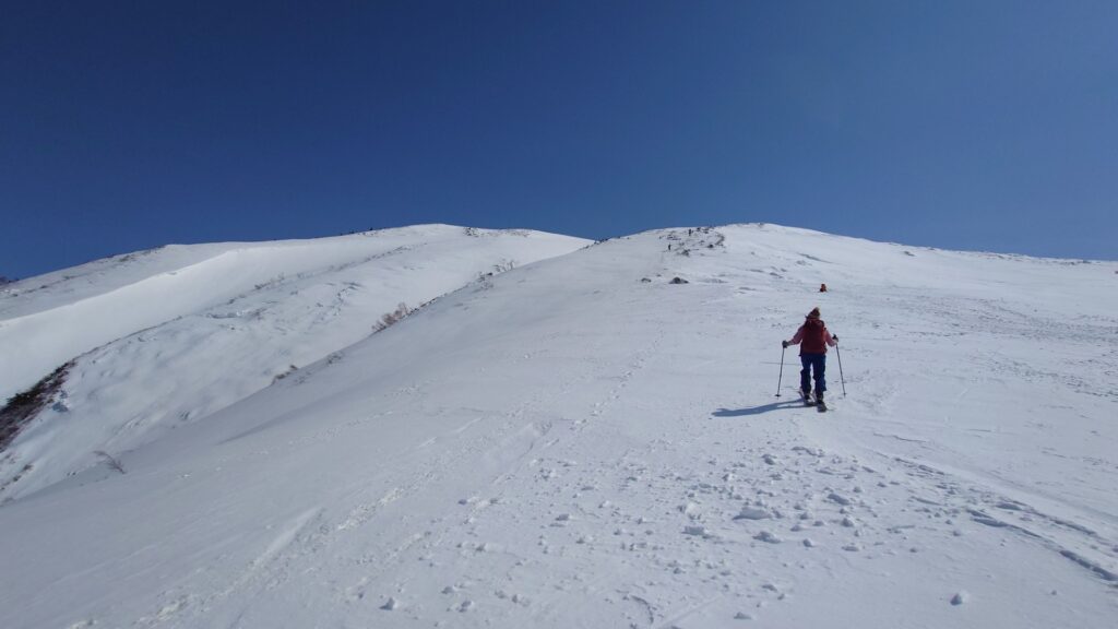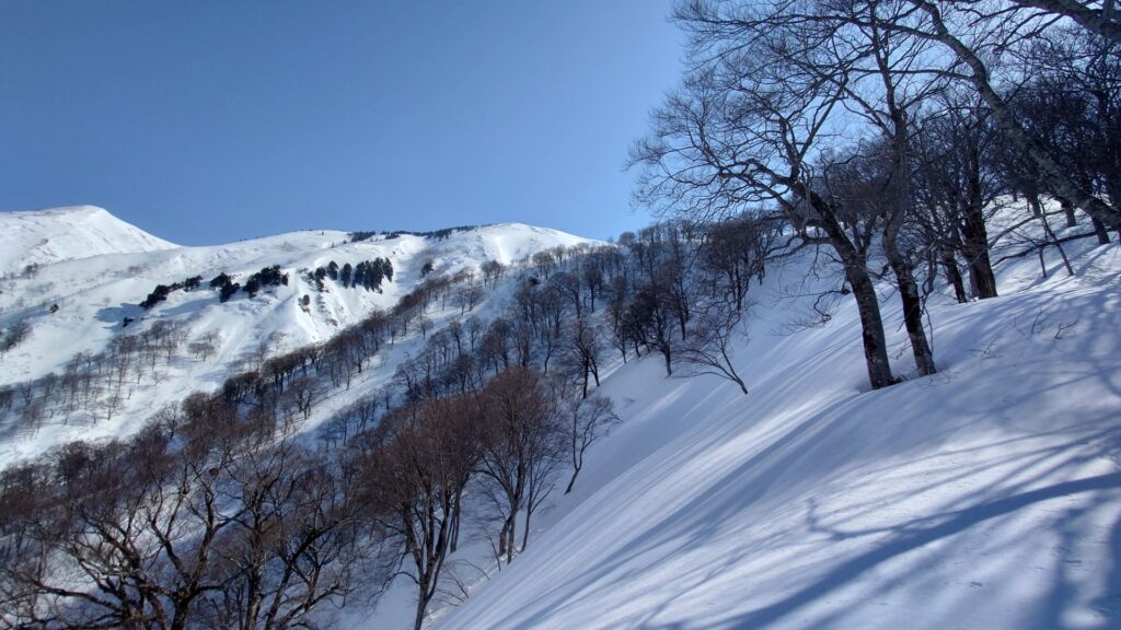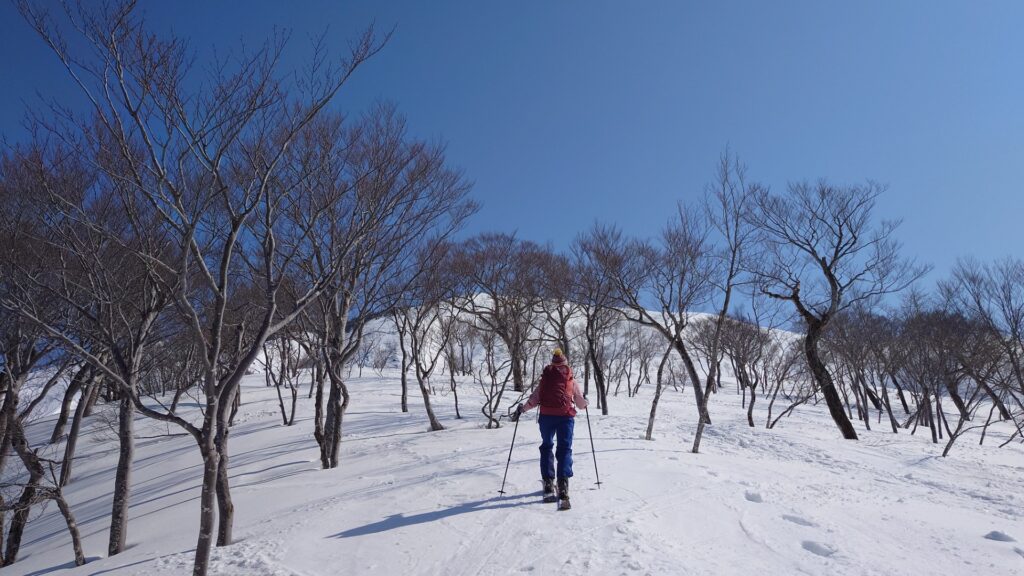 程よい樹間のブナ林を登っていきます。このあたり滑ると気持ちよさそうです。立派なブナ林から登るにつれ、ブナの丈が低くなり疎らになっていきます。やがて灌木の疎林になり無木立に。今日は最高気温が15度くらいまで上がるので雪は緩むと思っていました。しかしながら、全く緩む気配はなくカチカチ状態。日当たりはいいんですけどね~。朝の冷え込みが響いてるのかもしれません。